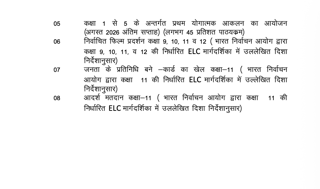 - कक्षा 1 से 5 के लिए प्रथम योगात्मक आकलन अगस्त 2026 के अंतिम सप्ताह में प्रस्तावित है।
