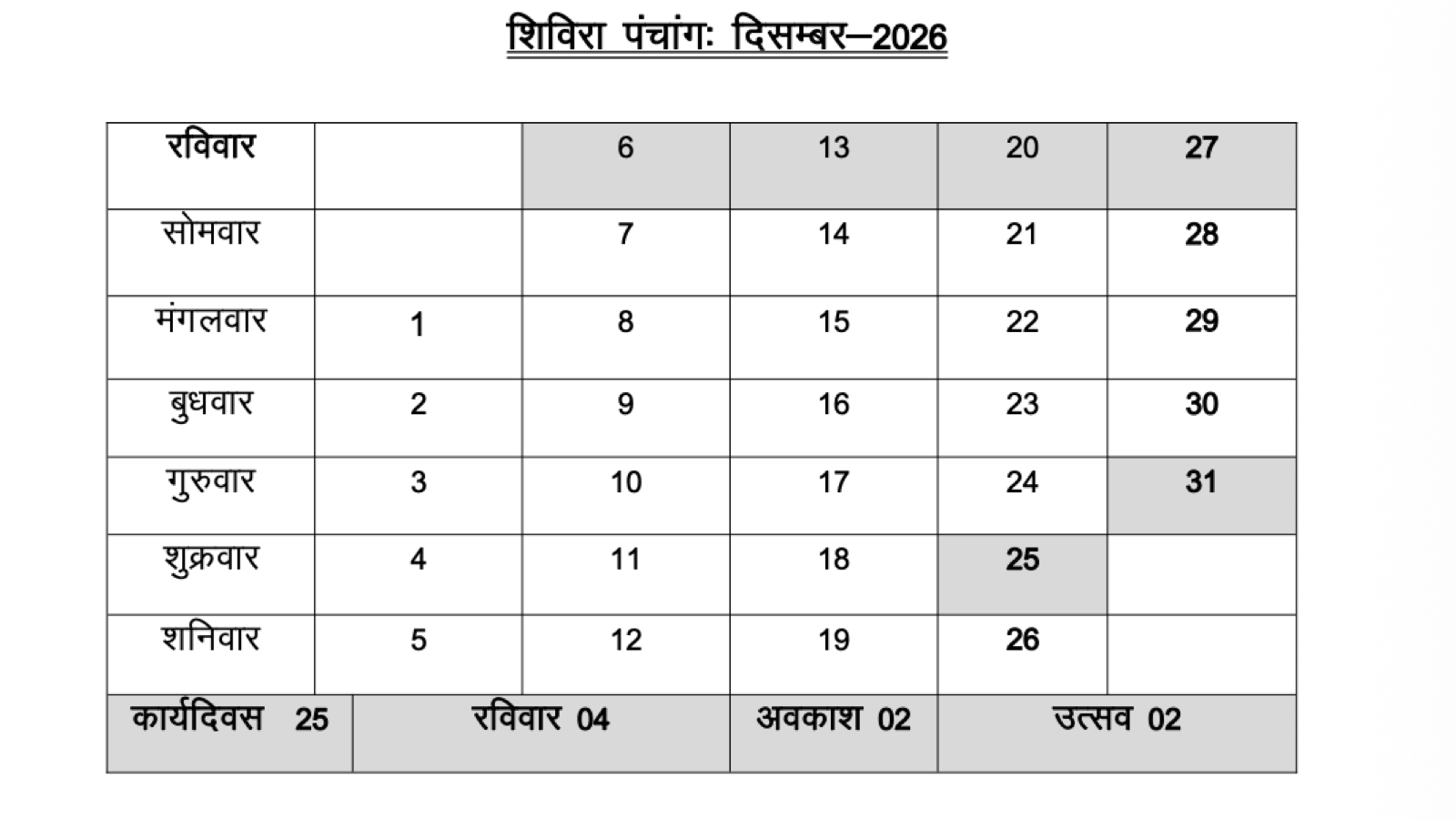 दिसंबर 2026 में कुल 25 कार्यदिवस, 04 रविवार, 02 अवकाश और 02 उत्सव सूचीबद्ध हैं।