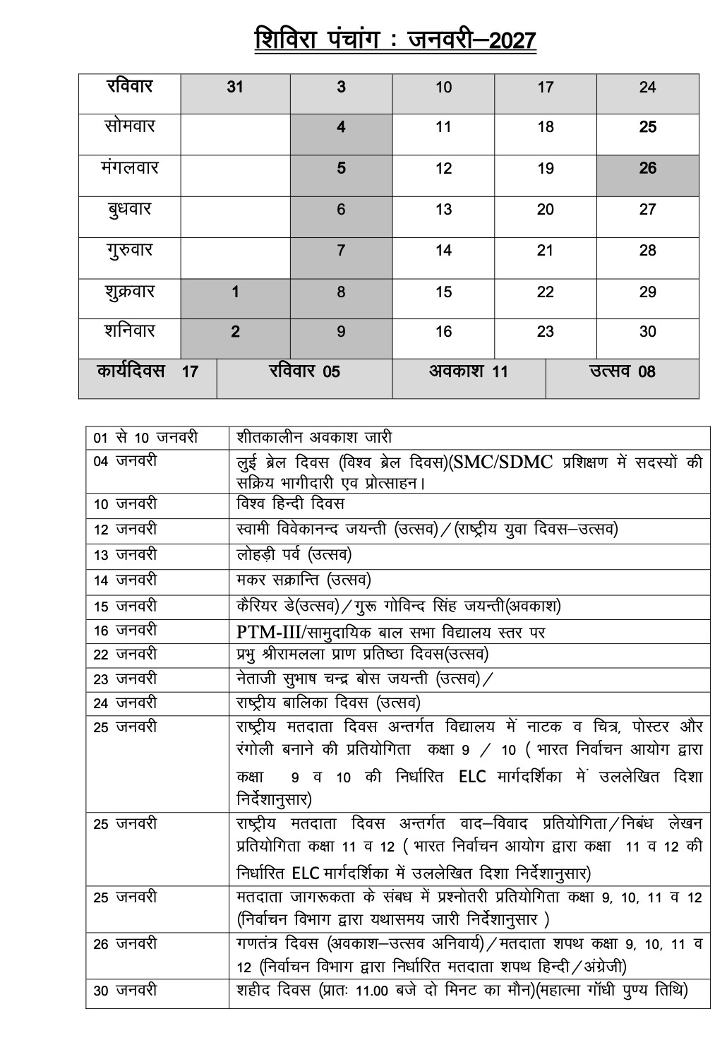 इस अनुभाग में जनवरी 2027 के मुख्य बिंदु संक्षेप में दिए गए हैं ताकि अवकाश, उत्सव और विद्यालय गतिविधियां जल्दी देखी जा सकें।