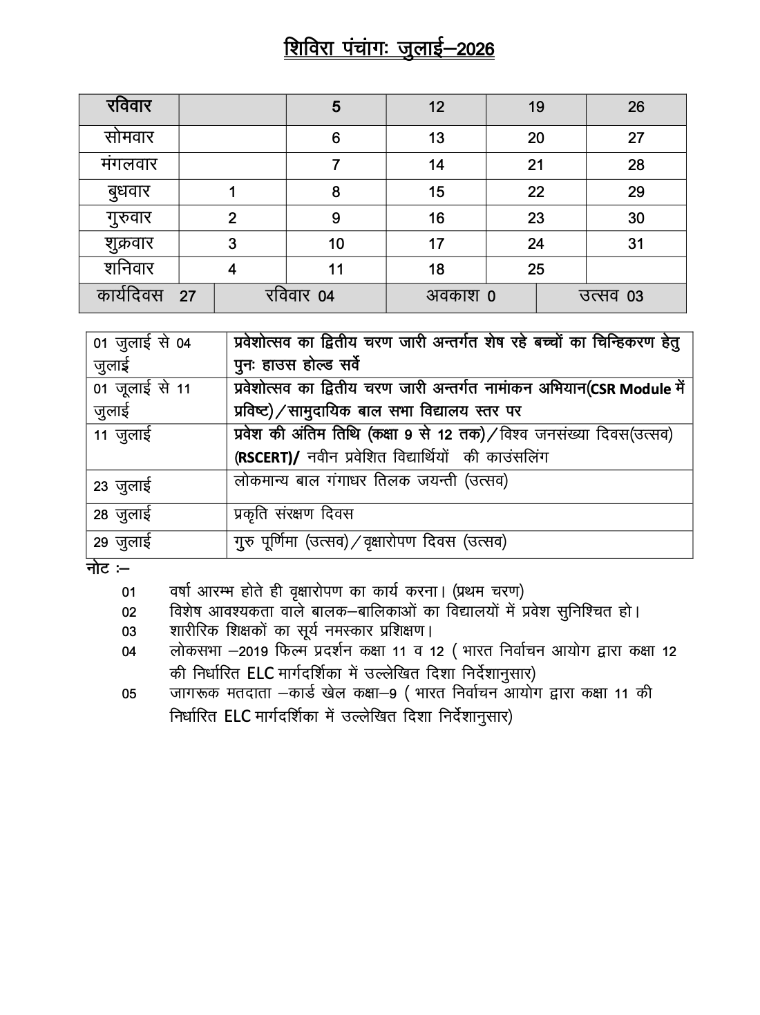 - प्रवेश और नामांकन: 01 से 11 जुलाई तक नामांकन अभियान, CSR Module में प्रविष्टि और नवीन प्रवेशित विद्यार्थियों की काउंसलिंग।